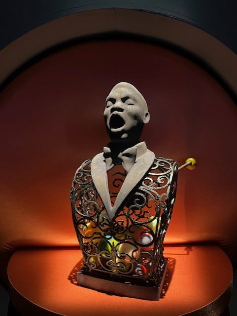 Sculptures punctuate the score—figures and forms built from a chorus of materials: wood and steel beside resin and fiberglass, rhinestones glinting against iron and wax. They read like reliquaries for rhythm and memory.