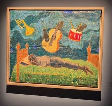 The choice to “cover” Palmer Hayden matters. Hayden’s own narrative scenes often elevate everyday Black life through lucid storytelling and emblematic objects. By retaining the essentials—a resting dreamer and airborne instruments—Fordjour honors that clarity, yet he also translates it into his vocabulary of abrasion and exposure. Tucked newsprint peeks through the paint skin, literally suturing public discourse (the printed page) to private interiority (the dream). In a show concerned with who gets heard and how, Dreamscape proposes listening as an inward practice first; the chorus we later meet in the darkened galleries begins as a hum inside one body.