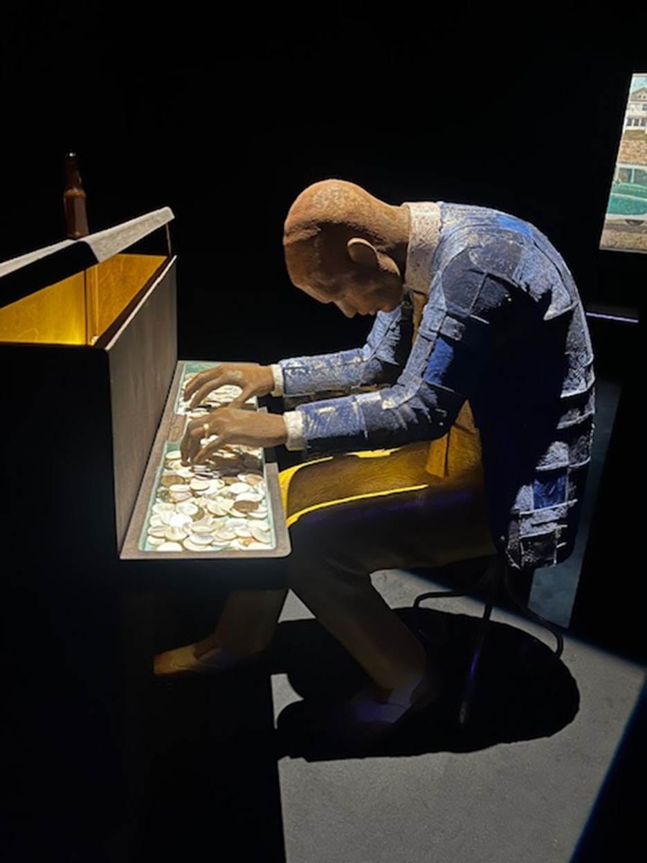 The title’s musical sign—“hold”—becomes a gesture of sustenance: breath gathered, time stretched. Layered materials (from dense industrial elements to iridescent inlays) make the figure both monumental and tender. You feel the weight of practice, the ache of repetition, the solace of return. It’s a sculpture about endurance—how a body becomes a vessel for sound, how a pause can carry a lifetime.